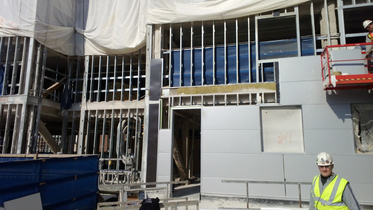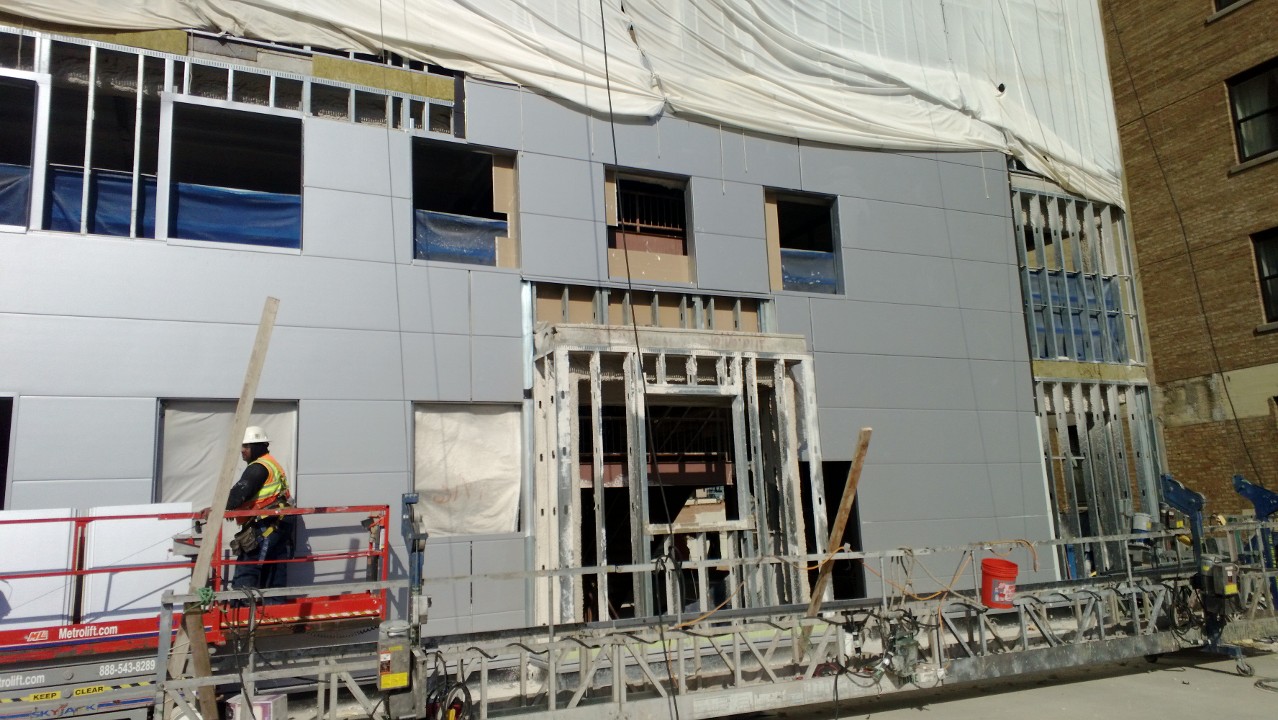 Well it is Friday and we wanted to show you the exterior. Cold, wind, snow, rain, it doesn’t stop LendLease our construction company from moving forward. When we had some beautiful sun the past couple days before this last snow storm, the new exterior skin was being applied to the building. This is a very difficult project as the entire outside is placed on the building like a puzzle. We are excited to see it go up over the next several weeks and give the building that distinct architectural look it was meant to have.
