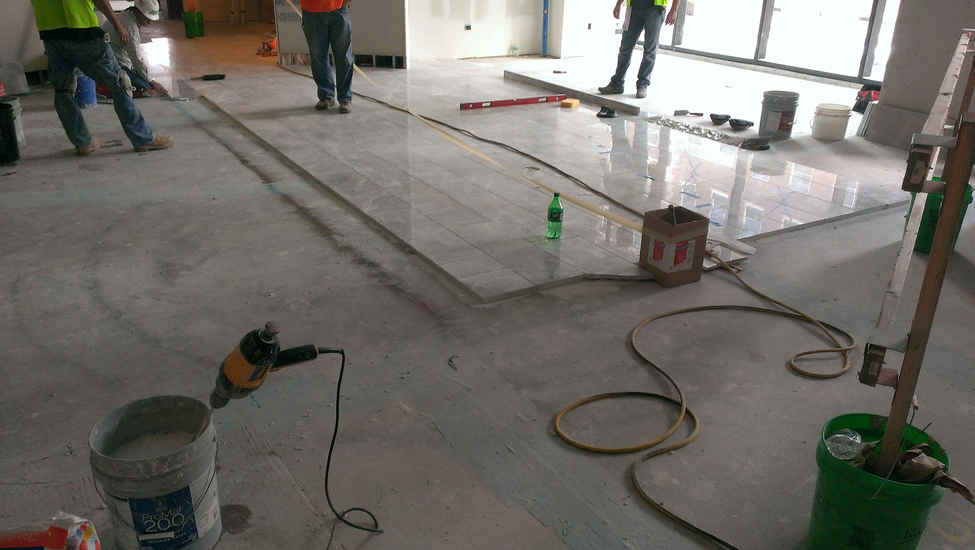 As an update to this post, we have more news on the lobby front. Gleaming, luxurious marble floors! Beautifully elegant marble lends a level of sophistication to the space. We can’t wait to show you the finished product, but for now, here’s a look at the floor thus far: