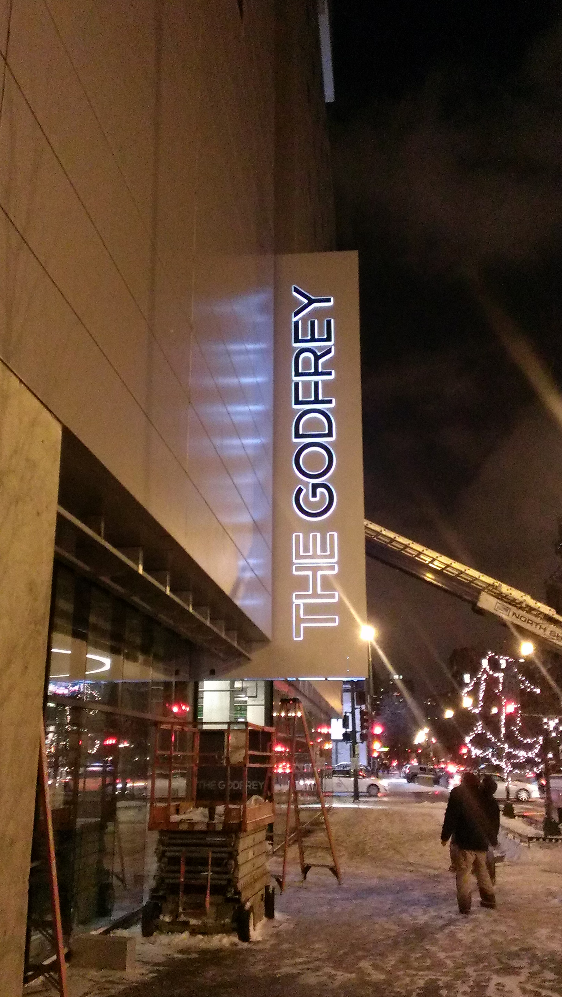 It’s coming together! The Godfrey Hotel Chicago sign was installed this week, meaning we’re that much closer to the grand opening. It’s an architecturally unique building, and a beautiful, sleek sign during the day. Then the sun went down and we saw this: