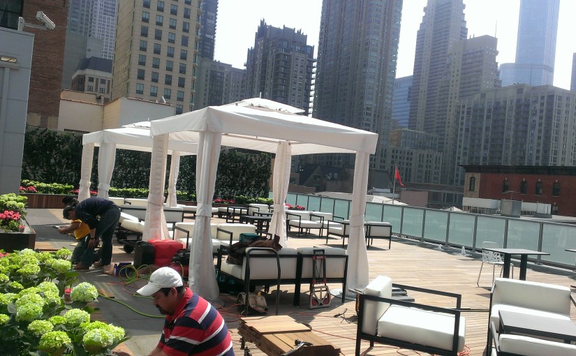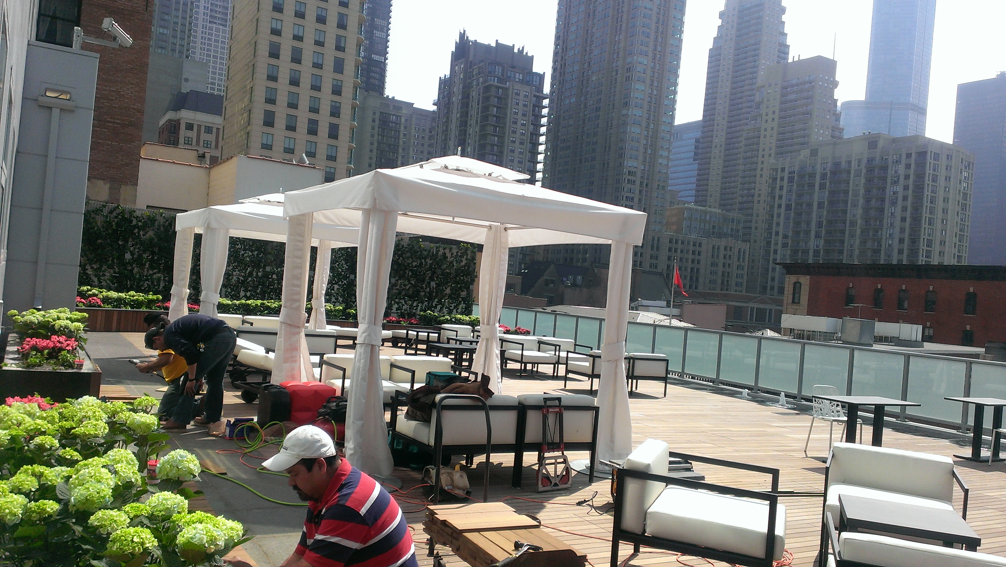Now that spring is finally here, we’re rejoicing and beautifying our indoor-outdoor rooftop, I|O Urban Roofscape. Yesterday, we added more lounge seating, additional water elements and more flowers. You can see a photo below of the installation in progress.